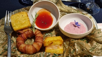 처음 나온 맥주는 아우터 레인지 브루잉 컴퍼니의 ‘인 더 스팁으로 알콜 도수 6.7%다. 인 더 스팁은 차 홉을 사용한 영국 IPA로, 자몽, 귤, 살구의 생동감 넘치는 풍미를 선사한다. 키아이와 인동덩굴과 송진의 은은한 향이 어우러진 맛이다. 흙내음과 소나무 향이 어우러져 균형 잡힌 맛이다. 드라이한 맛과 선명한 신선함이 어우러져 조화를 이룬다. 요리는 햇양파 삼겹살말이 튀김과 매운 고추, 마늘로 맛을 낸 토마토 소스, 생새우를 다져서 만든 멘보사와 훈제 액젓으로 만든 시저 드레싱이 나왔다.
