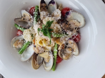 팬에 올리브오일을 두르고 마늘을 살짝 볶다 양파와 페페론치노를 넣은 후 소금과 후추로 밑간하여 볶아주다 바지락과 화이트와인, 면수를 넣어 조개 입이 벌어질 때까지 끓여준다. 삶은 페투피네면과 방울토마토를 넣고 볶아주다 소금과 후추로 최종 간을 맞추고 이태리 파슬리와 올리브오일을 뿌려 마무리하여 그릇에 담고 그라나 파다노 치즈를 뿌려 완성한다.